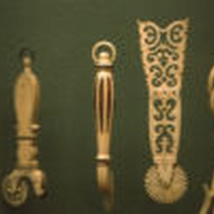 Close-up of three 19th century pie crimpers with intricate designs made out of whale teeth at the museum.