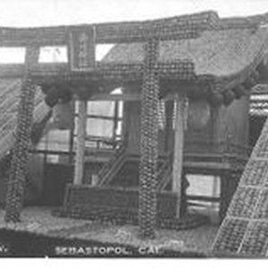 Postcard photo, black and white: A 1911 Gravenstein Apple Show Japanese exhibit of the "Shrine of NA__KO" made of apples and boxes of apples on either side.