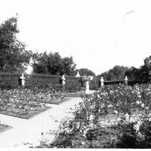 A view of the rose garden, with gravel paths, a fountain in the center, and busts on pedestals around the sides. The rose bushes have been trimmed back and have a small number of blooms.
