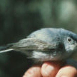 Close up of a blue-grey gnatcatcher held in a hand.