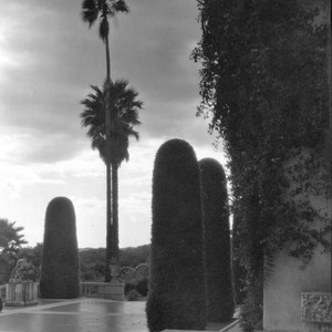 A view to the southwest of the residence showing vines on the walls, topiaries on the terrace, and tall palms in front of a clouded sky. Stamp on verso reads "Copyright Keystone Photo Service, Los Angeles." MS notes on verso read "9 1/2 x 7 1/2" and "Gift of Thomas V. Lange, 1994." MS note on folder reads "HEH residence: south facade and terrace, loggia and port cochère c. 1920."