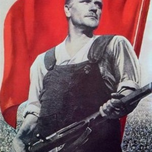 A poster showing a working-class man holding a rifle in his hands with a red banner behind him. The caption reads, "Esli zavtra voina..." meaning "If the war begins tomorrow". [Description English/roman)]