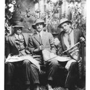 Photo- black and white: A staged photo of three young men at the 4th Annual 1913 Gravenstein Apple Show. Each man holds a pennant flag and sits in front of a scene with apples in the background.