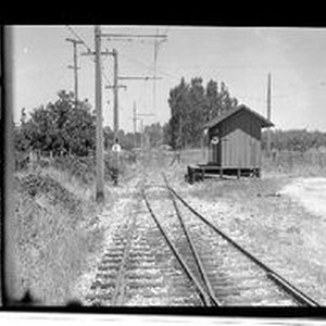 Photo--black and white: P&SR Cunningham Station train stop. Located about three miles south of Sebastopol and measuring 8 feet wide and 16 feet long, this small depot conformed to the standard size and design of P&SR. These ranch stations were small but provided shelter for passengers as well as pickup locations for produce and eggs and drop offs of freight, empty sacks, cartons and hampers.