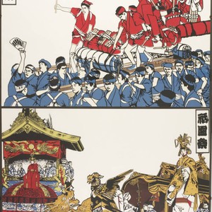One of four panels of a polyptych of a procession with carriages, dancers, and traditional costumes.