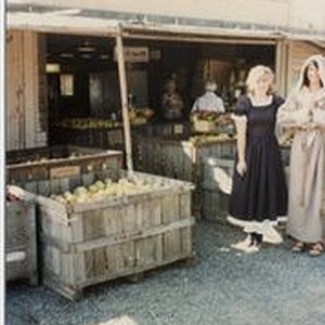 Donna Hallberg (Hallberg-Marovich and Marcia Hallberg in vintage costumes at the Hallberg Apple Farm roadside stand 1982