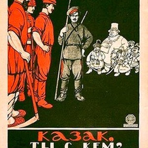 A poster. Caption reads, "Kazak, ty s kem? S nami ili s nimi? / Казак, ты с кем? С нами или с ними?", meaning, "Cossack, who are you with? Us or them?". [Description English/roman)]