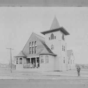 Photo--black and white: St. Sebastian's, Sebastopol, in October 1898, with men on steps and beside church wearing working clothes/aprons. The building no longer exists, but was located around the area of Santa Rosa Avenue and Depot Street in Sebastopol. The church was "opposite the Layton cottages on Bodega Avenue, near the depot,"referring to the Northern Pacific Railroad that opened a line from Santa Rosa to Sebastopol in 1890. This church was demolished in the 1950s and a new St. Sebastian's was rebuilt in late 50's on Covert Lane in Sebastopol.