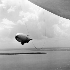 Inflight K-type blimp, left front - Title:Array - Image from the Theodore Bolduc collection. Ted enlisted in the Navy at the start of World War II and served as an Aviation Photographer, assigned primarily to "Lighter Than Air" (blimp) squadrons in Georgia and Florida. He married Navy nurse Bernice Fournier, from Waterville, Maine, in 1946.------Please Tag these images so that the information can be permanently stored with the digital file.---Repository: San Diego Air and Space Museum
