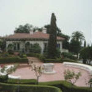 In the foreground manicured shrubs and hedges surround a bricked patio with marble benches and pedestal, with the Hearst Castle guest house in the background.