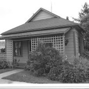 Photo, black and white: Sebastopol house at 7147 Burnett Street a cottage built in 1905 in the Burnett Addition. House photographed in 1993 by Evelyn McClure for her book "Sebastopol, California : History, Homes and People."