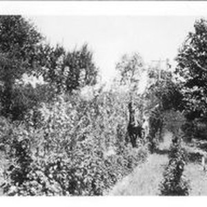 Photo--black and white: Burbank "White Blackberries" in bloom. "All- Fruit" berries in foreground. Unknown man and horse plowing between rows. April 28, 1931.