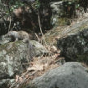 A squirrel sitting on mossy rocks along Vernal Falls Trail.
