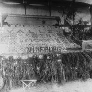 Photo--black and white, from Borba 8" x 10" celluloid negative: Gravenstein Apple Show display of Vineburg with an apple box to the right with the "Valley of the Moon" logo. about 1930.