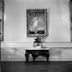 Sir Thomas Lawrence's Sarah Goodin Barrett Moulton: "Pinkie" (1794) hanging on a wall in the portrait gallery in the Huntington residence. The bronze sculpture is Renommée (Fame) by an unknown foundry, after Antoine Coysevox, made between 1700 and 1710. Label accompanying photograph in album reads "HEH 24 View of "Pinkie" by Sir Thomas Lawrence. Georgian table with bronze reduction of original stone statue of Coysevox' "Fame," which stands at entrance to Tuilleries in Paris. Huntington Art Gallery." Photograph appeared in Los Angeles Times article of November 6, 1938.