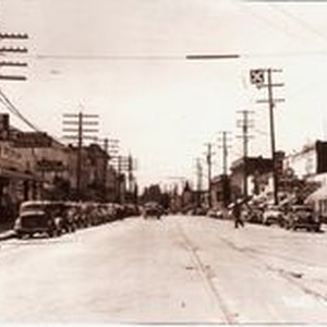 Photo black and white- Main Street Sebastopol circa 1940s. Stores visible are Sprouse-Reitz Co, Sylvia's Restaurant, Turley's Bakery, the IOOF building, Carlson's, Blue Room and in middle background the steeple of the Congregational Church.