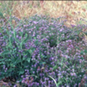 Plant with small purple flowers amid dried grasses.