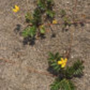 Close-up of small green leafy plant with yellow flowers growing out of sandy beach during the summer.
