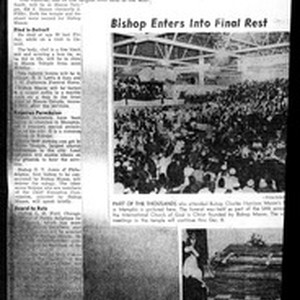 Obituaries (2 copies), Charles Harrison Mason, 1961. (1) Clark Porteous. "12,000 are expected at Bishop Mason's funeral: founder of church to be buried in marble vault at Temple Tuesday" in Press-Scimitar 1961 November 26. (2) "Bishop enters into final rest" in Press-Scimitar 1961 November 28. [Description English/roman)]