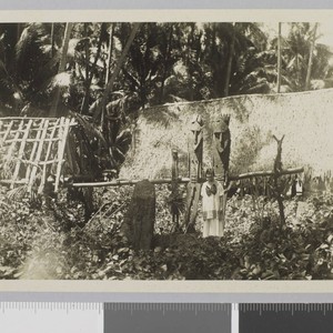 Osa Johnson stands in front of a group tribal sculptures and a thatched roof dwelling. Title transcribed from envelope. Date from biographical sources. Verso of photo reads: "Lua-nua of Solomons Lord Howe atoll." Lua nua is one of the Solomon Islands.