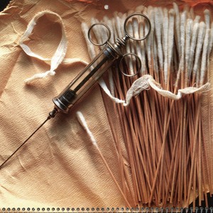 Scope/Content: October image titled The Syringe from a 1989 calendar titled Advances in Healthcare; items pictured are from the University of California, San Francisco Archives, Health Sciences Artifact Collection; calendar copyright 1988 Harwood Co.; syringe with needle and cotton swabs from a 1930s ambulance kit.
