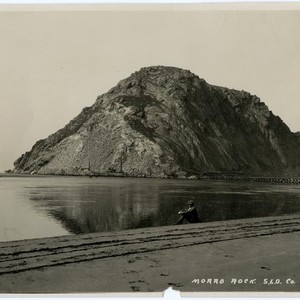 Man sitting on a wet beach, with Morro Rock across the bay.