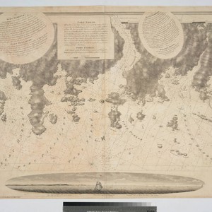 Kashnor notes, "A fine and rare chart by J. F. W. Des Barres." Gives sailing directions for entering each port. View of land from Cape Spry to westernmost ledge of Pegasus Wing.. Prime meridian: GM. Relief: pictorial. Graphic Scale: Miles, statute. Projection: Mercator. Watermark: Crowned fleur-di-lis V I. Printing Process: Copper engraving. Other Features: Vignettes. Verso Text: Ms note: 116.