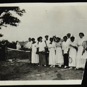 Photograph of 12 unidentified people (7 women, 5 men) with tennis racquets, [s.d.]. "Pallie when they woman pay ... let Walter have ... and I will give ... 25 [cents] back ...nt to pay the furniture man" -- written on back. [Description English/roman)]