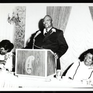 Photograph of Church of God in Christ Bishop T.L. Young at banquet, [s.d.]. [Description English/roman)]