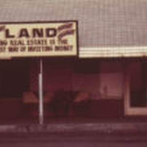 Sign outside offices: "LAND. Buying real estate is the safest way of investing money".