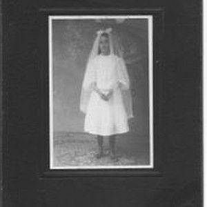 Photo--black and white, matted: Studio portrait of girl in Confirmation dress, girl unidentified.