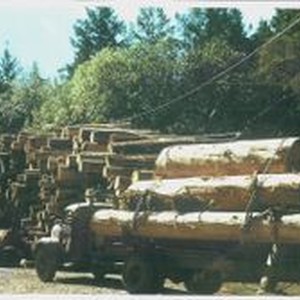Photo, color: Sturgeon's sawmill log deck, Green Hill Road early 1950s. Redwood logs are chained to a truck bed to be unloaded to the log deck. Vintage Reo truck visible.