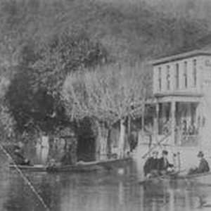 Postcard--photo--black and white: The Garibaldi Hotel in Guerneville during a flood of the Russian River 1906. Two boats with men in water in front of the hotel. On reverse side addressed to Mrs. S. G. McGrew of Sebastopol and double post marked Jan 24 and Jan 25, 1906.
