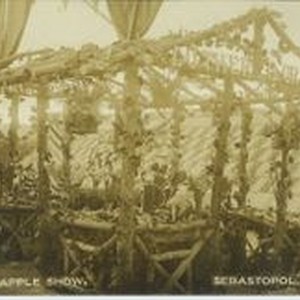 Postcard--black and white photo postcard--Gravenstein Apple Show 1910--Luther Burbank display made of wooden logs and decorated with vines and flowers. The first Sebastopol Apple Show was held in a tent across from the Petaluma & Santa Rosa Depot in August, 1910.