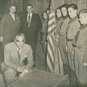 Public relations event at the Strand Theatre with screen actor Boris Karloff signing a cement slab 'Stop! Beware, Boris Karloff' in front of six Boy Scouts and two other persons, circa 1936. The slab was later installed on the sidewalk to promote safe street crossing.
