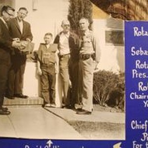 Poster photo of Delbert Triggs, president of Sebastopol Rotary, Rotarian Jack Hanley, Superintendent of Sebastopol Elementary School, Rotarian Dick Hogan, Chairman of Rotary Youth Committee and Jack Pilgrim, Chief of Police, Sebastopol and young David Collinsorth being presented with garments for the schools Safety Patrol, about 1950