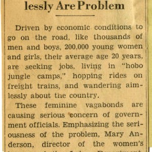 The plight of jobless women during the Great Depression, and a plan for federal camps. Publisher unknown.