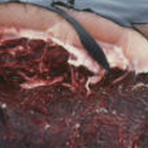 Section of whale skin, blubber and underlying muscle in dorsal thoracic region. There is much myoglobin in the muscle as representative of the darker areas.