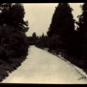 View of a dirt road lined by tall trees. Photographed by Curtis Studio. Like the other photos in this album, the focus is soft.