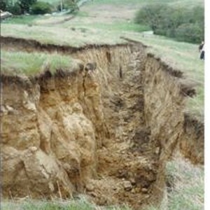 Photo--color: View of the damage caused by a landslide in western Sonoma County April 1983 in the Blucher Valley area of Sebastopol. Heavy daily rains from mid-January to April saturated the ground. The land--a field above Blucher Valley Road--split at the crest of a steep, hilly field owned by the Bolt family. The 'crack' is still there today--2009. Landslide details provided by Frank Baumgardner.
