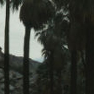 A group of palm trees. Location is indicated as "view to desert three; Borrego Palm Canyon."