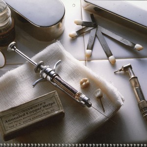 Scope/Content: February image titled Dentistry from a 1989 calendar titled Advances in Healthcare; items pictured are from the University of California, San Francisco Archives, Health Sciences Artifact Collection; calendar copyright 1988 Harwood Co.; dental instruments, annealed copper strips, teeth, syringe and needle.
