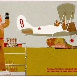 A posted dedicated to the young pilots of the Soviet air fleet. Caption reads, "Kazhdyi kolkhoz, kazhdyi zavod letchika dast v nash vozdushnyi flot! / Каждый колхоз, каждый завод лётчика даст в наш воздушный флот!", meaning, "All collective farms (kolkhozes) and factories will produce one pilot each for our air fleet!". [Description English/roman)]