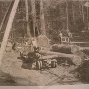 Photo--black and white: A-frame used to load cut logs on a truck, Mendocino County.