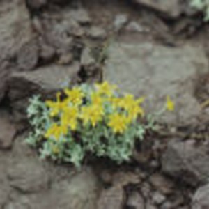 Grayish leaves with yellow flowers grow out of rock at Mount Scott.