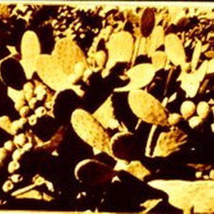 Slide--black and white photo: Burbank spineless cactus with fruit on cactus leaf.