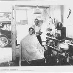Photocopy--black and white: Ben Brians at his Barber Shop in Occidental, California. Young boy in barber chair with Ben Brians standing behind. Several shelves with various bottles. Sink and marble top cabinet against wall next to shelves. Hand gun hanging on wall and about 1915 calendar. Car visible outside. Kid in barberchair is John Houseman. Ben Brians was Harry Lapham's uncle. Harry grew up in Occidental and is an Occidental / Sonoma County historian. The barber shop is the former site of Lazare Pare's saloon.