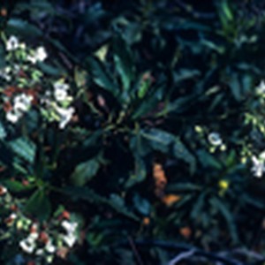 Close-up of open, white flowers, flower buds, and dried up flowers against background of dark green leaves.