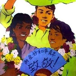 Soviet poster. Caption on top reads, "Юности мира привет! / Iunosti mira privet!", meaning, "Greeting to the world's youth!". [Description (original non-English/roman language/script)]