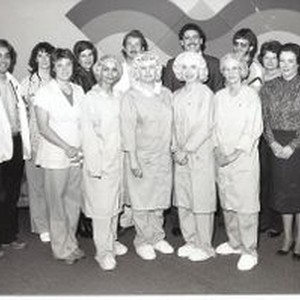 Photo--black and white: Palm Drive Hospital Three year service awards, 1984. Fourteen unidentified staff. One man identified as Dennis Hartigan.